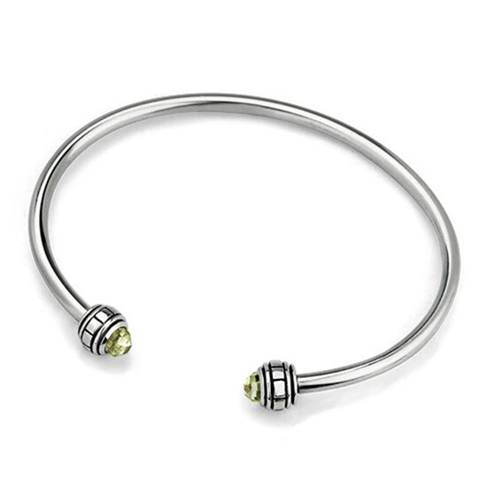 The OHM C BANGLE is an open bangle with end caps studded with colored CZ or stone. The caps unscrew to allow you to load up the bracelet design of your choice. An open “C” shape the bangle is slightly adjustable, and quite rigid.