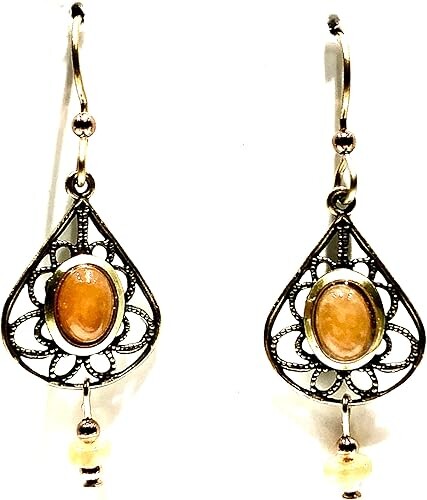 Filigree teardrop with amber aventurine stone eangle Earrings on surgical steel ear wire. 1.5 inch drop.