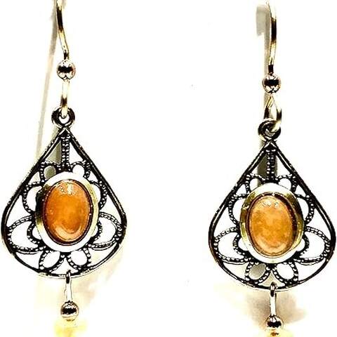 Filigree teardrop with amber aventurine stone eangle Earrings on surgical steel ear wire. 1.5 inch drop.