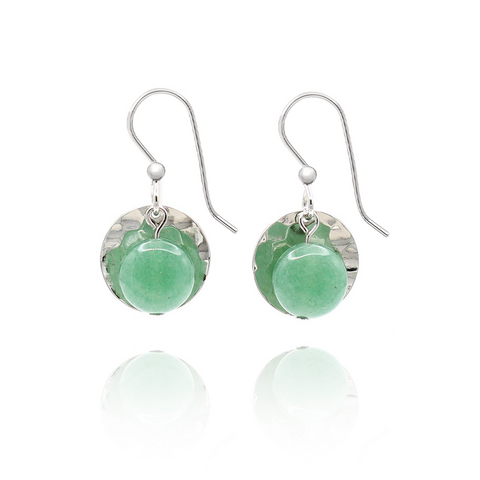 Polished green lentil bead on 1/2" hammered disc with sterling silver ear wire. Made in Vermont, USA